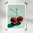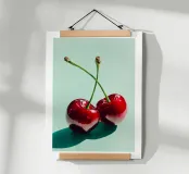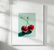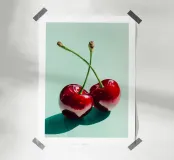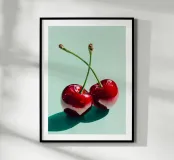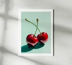 Glossy illustration of two ripe red cherries with crossed stems casting a soft shadow on a mint green background. This modern kitchen print adds a sweet, playful touch to your cooking space and brings a bright fruity pop of color to your dining or breakfast area.
