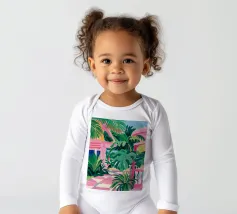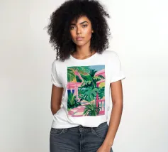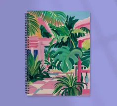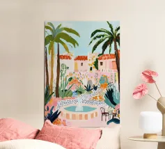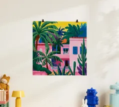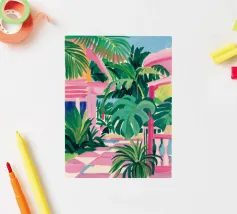 An elegant, tranquil scene featuring pink architectural elements, a patterned pathway, and lush green palm leaves, suggesting a modern and chic tropical resort.