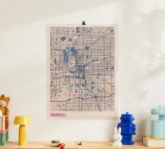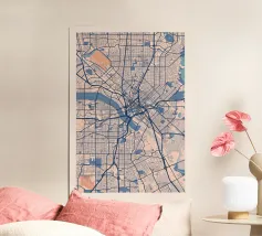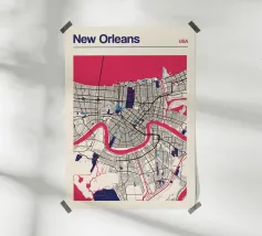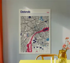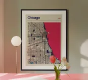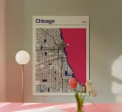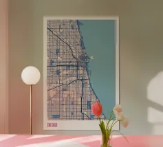 An iconic work of art that captures Chicago's unique street grid and its striking Lake Michigan shoreline. The precise depiction combines urban structures with minimalist lines and bold colours to create a timeless design.