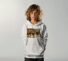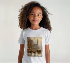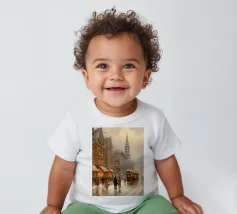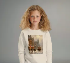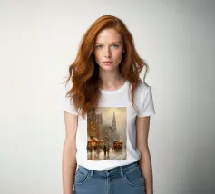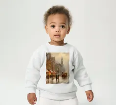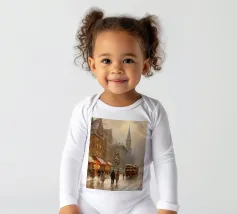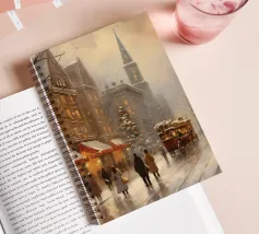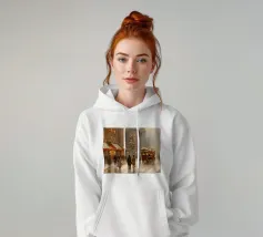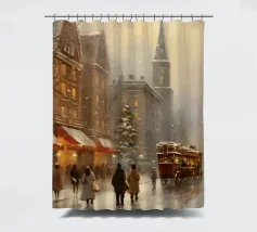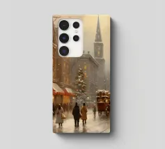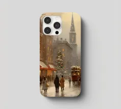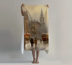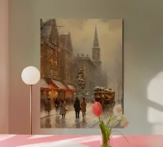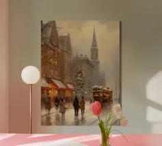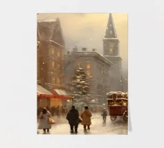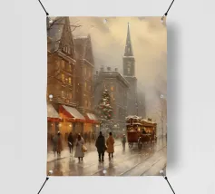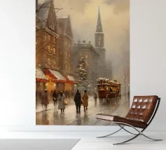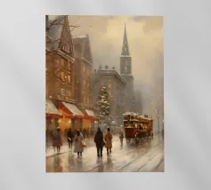 A nostalgic cityscape in a gentle snowfall: people stroll through festively lit streets, a horse-drawn carriage passes by and a decorated Christmas tree shines in front of an old church. This winter artwork captures the magic of times gone by - warm, romantic and elegant. Ideal for murals, mugs, textiles or seasonal decoration in vintage style. Christmas town, winter landscape, vintage Christmas, snow-covered town, Christmas art, nostalgic motif, winter magic, festive atmosphere, Christmas decoration, retro design, Christmas tree.