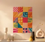 A vibrant and cheerful abstract piece resembling a patchwork quilt, with various patterns and textures in bright, sunny colors. The artwork is a joyful celebration of color and form.