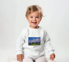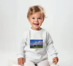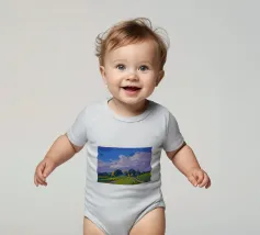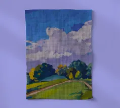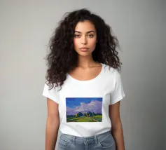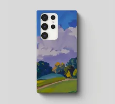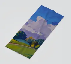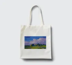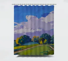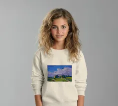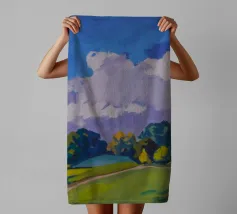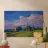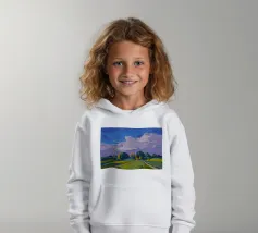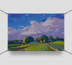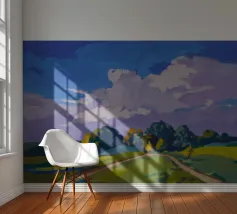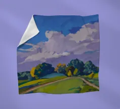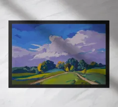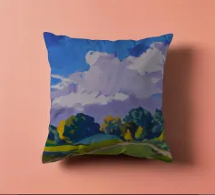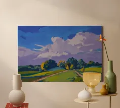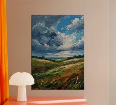 A landscape painting of green fields under a dramatic sky with large, billowing white and grey clouds. Patches of sunlight break through, illuminating parts of the landscape.