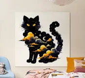 Cat art portrait with clouds and celestial symbols.