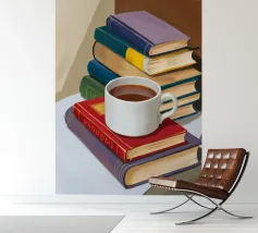 A simple, cozy still life of a cup of hot coffee resting on a stack of old books. The play of light and shadow creates a warm, intellectual, and comforting atmosphere, perfect for any book lover.