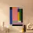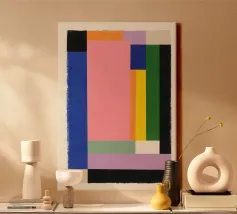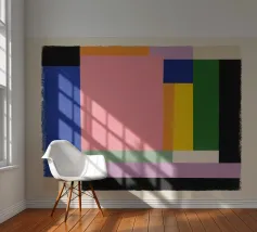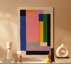 Abstrakte Komposition aus farbigen Rechteckblöcken in einem symmetrischen Raster. Schwarz, Blau, Rosa, Orange, Grün, Lila und Weiß fügen sich zu einer harmonischen Struktur auf beigem Hintergrund mit feiner, körniger Textur zusammen.