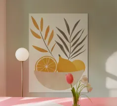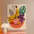 An explosion of shapes and colours that revisits the traditional still life with a modern, artistic twist. Bananas, grapes and citrus fruits mingle in a play of textures and patterns, creating a captivating and warm composition.