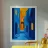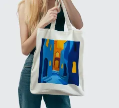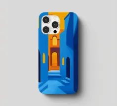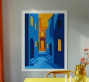Abstract architectural illustration combining vibrant shades of blue and orange, depicting a play of light and shadow in a maze of buildings with geometric arches and windows. This minimalist, modern design evokes a Mediterranean ambience while capturing a contemporary aesthetic. Perfect for adding a touch of dynamism and sophistication to a space or art project.
