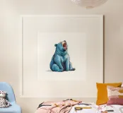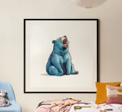 A blue bear in a comic style. The bear is yawning and looks tired or as if he has just woken up.