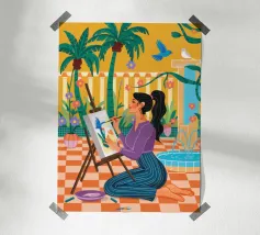 Artist at work painting a vibrant canvas featuring a flower and abstract shapes, surrounded by brushes, colors, and inspiration.