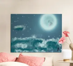 Wisps of clouds drift gently past, partially veiling the moon like a sheer curtain. The sky is calm and quiet, with the clouds tinged in pale hues of lavender and grey. The moon’s subtle light peeks through the shifting mist, creating a dreamlike, almost magical atmosphere above the sleeping world.