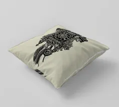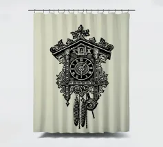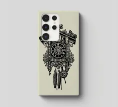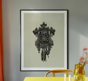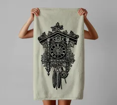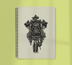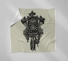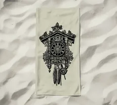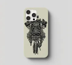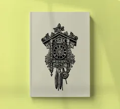 Product description: This ornate design features a detailed illustration of a classic vintage-style cuckoo clock. With its intricate carvings, traditional elements such as the hanging weights and the roof made of carved leaves, the motif embodies timeless elegance and a touch of nostalgia. The combination of precise lines and shaded details creates a sophisticated, hand-drawn look that is perfect for lovers of retro and classic designs. The subtle beige background emphasises the black illustration.
