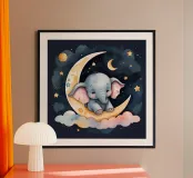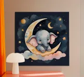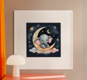 Cute baby elephant resting on a crescent moon poster