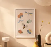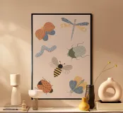 A charming bugs illustration featuring a bee, ladybug, moths, and a sweet little caterpillar scattered across the design. Created in cheerful tones of yellow, blue, green, sage, and burnt orange, this playful insect artwork is perfect for nursery wall art, kids room decor, and nature-inspired playrooms. A colorful and whimsical piece for little explorers who love the tiny wonders of the outdoors.