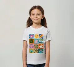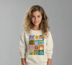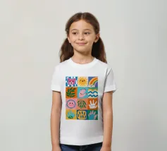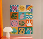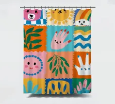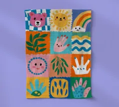 A colorful patchwork quilt design featuring cute characters like a sun, a rainbow, a lion, a bunny, and abstract hands on checkered backgrounds.