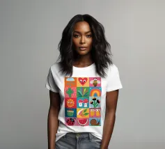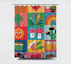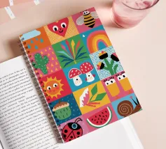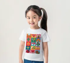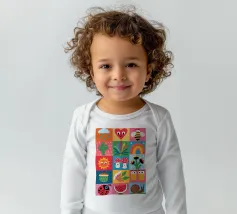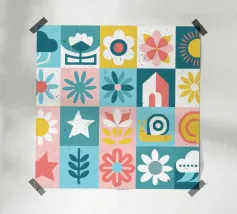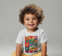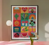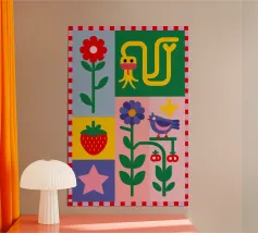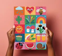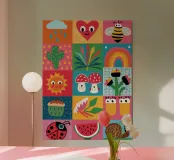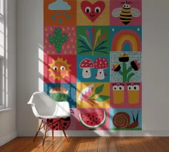 A delightful patchwork quilt of cute and colorful garden icons, including a friendly bee, a rainbow, a smiling sun, and a ladybug. This artwork is a pure expression of joy and childlike wonder.