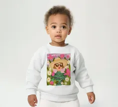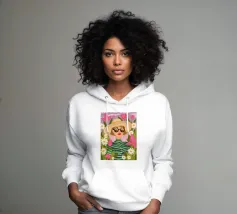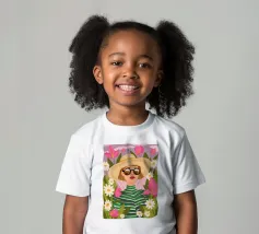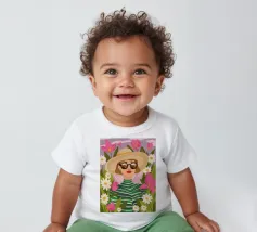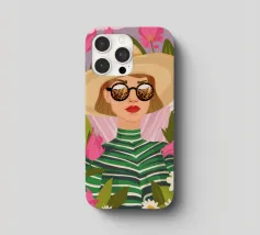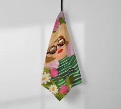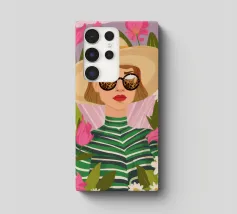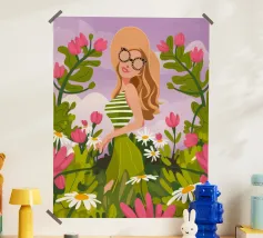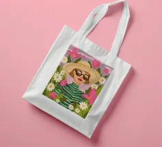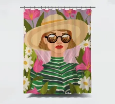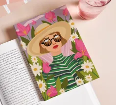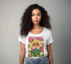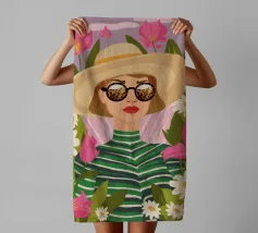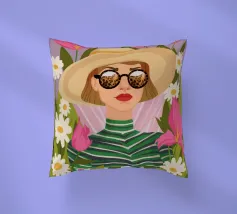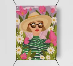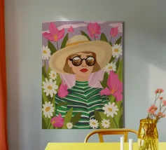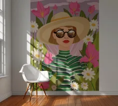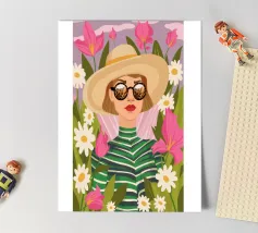 A portrait of a stylish woman in a large sun hat, sunglasses, and a green striped top, surrounded by daisies. The composition is a chic, playful, and joyful celebration of sunny days and vintage-inspired fashion.