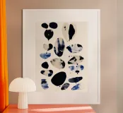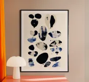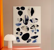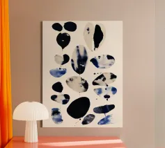 An abstract watercolor composition of scattered, organic shapes floating across a soft ivory ground. Inky blacks, deep indigo, and washed stone tones bleed and overlap, creating subtle texture and variation within each form. The loose spacing and irregular silhouettes give the piece a sense of lightness and quiet movement, balancing structure with spontaneity. Modern and restrained, this artwork works well in minimalist, contemporary, or gallery-style interiors, offering visual interest through contrast, rhythm, and negative space rather than overt imagery.