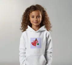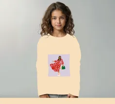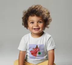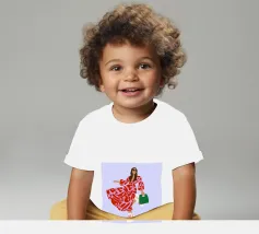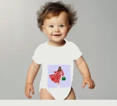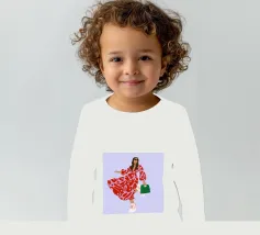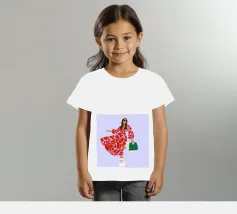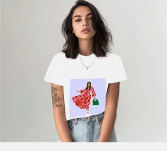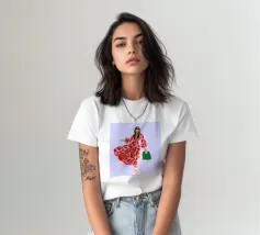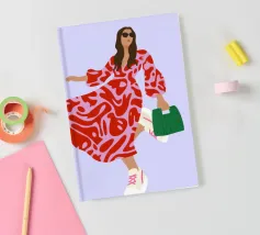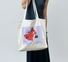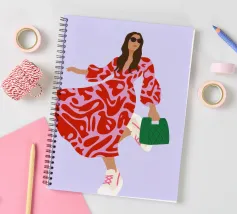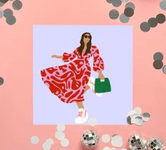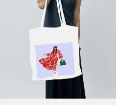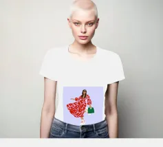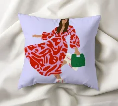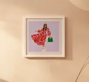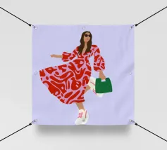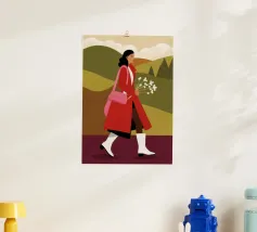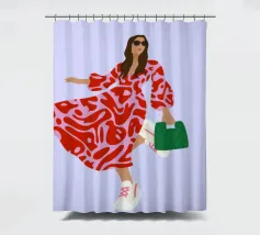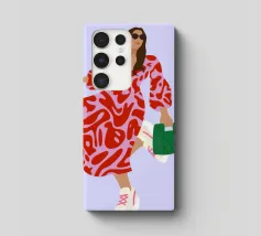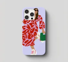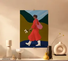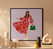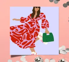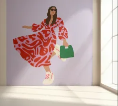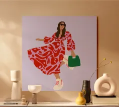 This artwork shows a person walking confidently in a flowing red dress with white and red patterns. The person is carrying a green handbag, and the background is a soft lavender color, highlighting the elegance and movement of the figure.