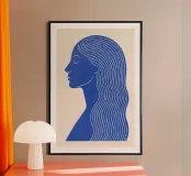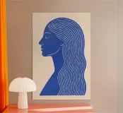 Dieses reduzierte Frauenporträt im Linolschnitt-Stil zeigt die Ruhe und Stärke weiblicher Präsenz. Die klaren Linien des Gesichts und das fließende Haar in tiefem Blau erzeugen eine harmonische Balance aus Form, Stil und Gefühl. Ideal für ruhige, moderne Räume, kreative Galeriewände oder feministisch inspirierte Kunstsammlungen.