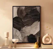 An abstract exploration of form and rhythm, this piece layers organic shapes with fluid stripes and tonal washes. The interplay of soft watercolor textures and bold linework creates a sense of depth and motion, capturing a balance between spontaneity and structure. Its monochrome palette gives it a refined, timeless appeal.