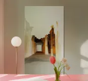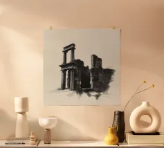 A hauntingly beautiful digital reconstruction of ancient architecture dissolving into light and abstraction. Soft amber and ivory tones merge with geometric precision, giving the impression of classical ruins caught between presence and memory. The faint silhouette of a lone figure enhances the scale and emotional depth, evoking themes of history, decay, and transcendence.