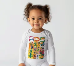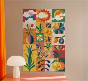 A vibrant patchwork of different patterns and motifs, combining floral elements, abstract shapes, and tiled designs. The eclectic mix of colors and styles creates a visually rich and joyful composition, reminiscent of a Mediterranean tile wall.