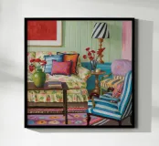 A vibrant, eclectic parlor filled with a mix of patterns and colors. A floral sofa, a striped armchair, and patterned wallpaper create a maximalist's dream, full of personality and creative energy.