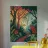 A vibrant and stylized illustration depicting a whimsical forest scene. A winding reddish path leads the viewer through a dense array of colorful trees and lush, oversized foliage. The color palette is rich and varied, with deep greens, reds, oranges, and hints of lighter blues and yellows, creating a fantastical and inviting atmosphere. The art style is bold and graphic, emphasizing shapes and textures over realistic detail.