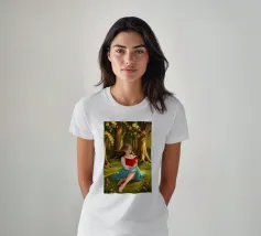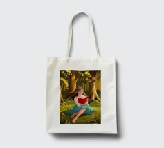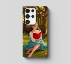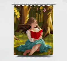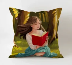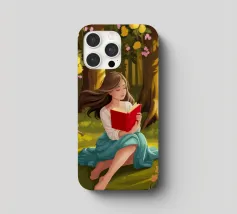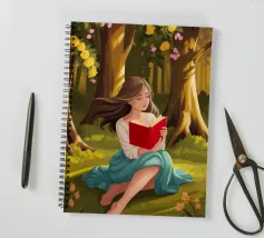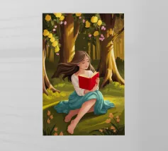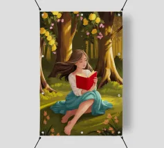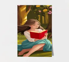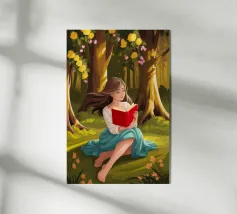 A person sits on the grass in a serene forest, engrossed in a book. Warm golden light filters through the trees, creating a magical and tranquil atmosphere.