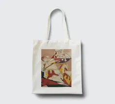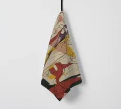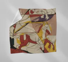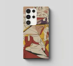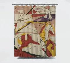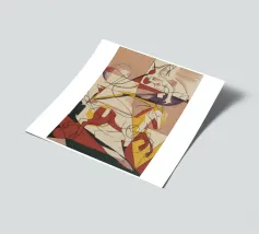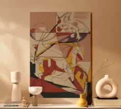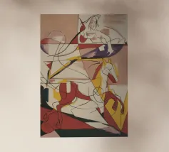This painting showcases abstract figures in vibrant colors, including red, yellow, and purple. The composition is lively and full of energy.