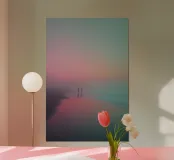 Two figures walk silently along a shoreline wrapped in mist, where hues of dusty pink and seafoam green melt into one another. Their mirrored silhouettes ripple softly across the wet sand, blending into the calm expanse of gradient light. This artwork evokes the ephemeral beauty of shared paths—brief, quiet, and eternal. A study in color, connection, and atmosphere, rendered in meditative stillness.
