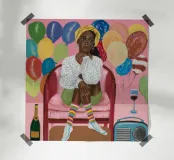 A person is seated on a couch with balloons in the background. There is a glass of wine, a bottle, and a radio on the table.