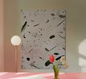 This minimal composition of spontaneous splashes, fine specks, and brisk ink marks recalls botanical sketches caught in motion. The muted greens and soil-browns drift like windblown leaves across a pale ground—studied yet wild, like nature annotated in shorthand.
