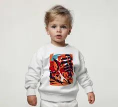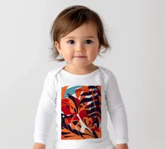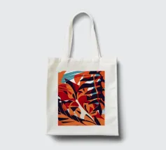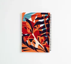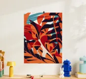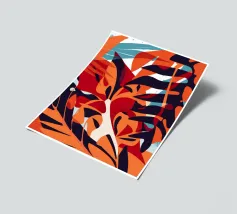 An abstract composition of tropical leaves in fiery shades of red, orange, and black creates a passionate, energetic, and bold botanical artwork.