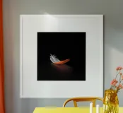 A single feather floats in the dark room – a tranquil moment between lightness and balance, with a warm colour accent.
