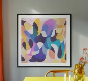 A vibrant abstract pattern featuring a harmonious blend of blue, purple, and orange hues. This modern, minimalist design showcases smooth geometric curves and flowing shapes, creating a playful yet elegant aesthetic. The composition is both cute and feminine,, evokes creativity and warmth.This abstract pattern features a dynamic interplay of bold and soft elements, blending rich shades of blue, violet, and orange in a smooth, flowing composition. Modern and minimalist in structure, the design uses geometric curves and organic shapes to create a sense of motion and harmony.