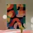 Flowing, translucent, organic shapes in a palette of red, orange, and teal seem to dance and overlap against a dark background, creating a fluid and dynamic abstract composition.