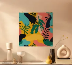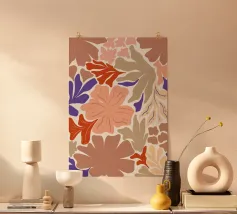 A vibrant, seamless pattern of stylized leaves and botanical shapes in a palette of red, blue, pink, and yellow, creating a sense of rhythmic, natural movement.