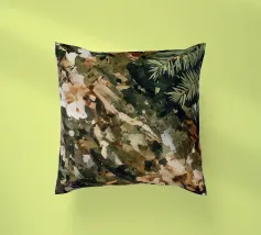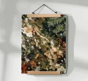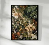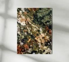 A dense, layered tangle of needles, bark, and earth tones, this painting captures the fragmented beauty of the ground beneath a pine canopy. Chaos becomes composition in a textured interplay of dark greens, rich browns, and scattered ivory light—like a memory of walking through woods just after rain.