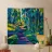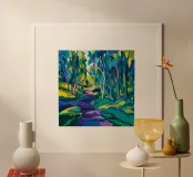 An expressive, painterly landscape of a path alongside a stream flowing through a forest. The vibrant blues, greens, and yellows create a dynamic, beautiful, and slightly abstract depiction of a walk in nature.