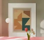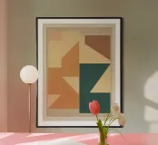 An abstract geometric artwork with bold shapes in earthy orange, green, and beige tones, arranged on a textured light background with a framed border.