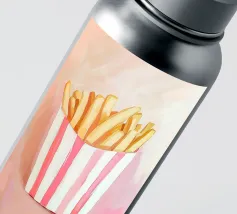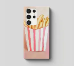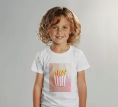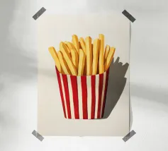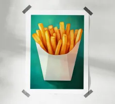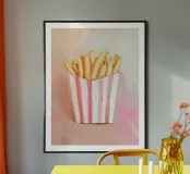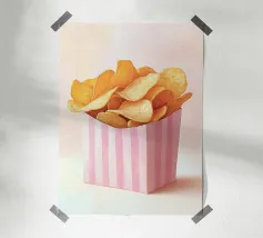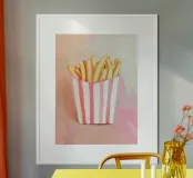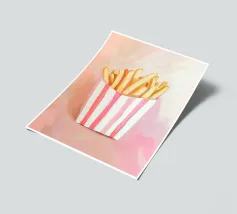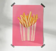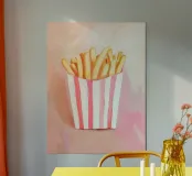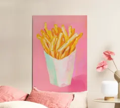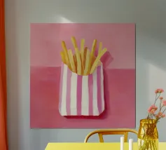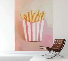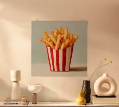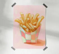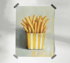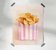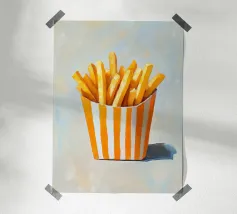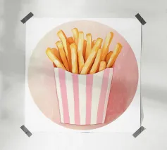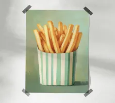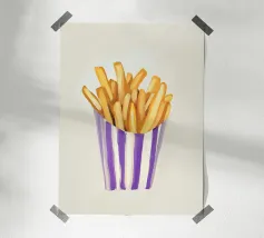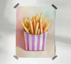 This charming illustration of French fries in a pastel striped box captures the nostalgic retro look of the popular snack. With soft brushstrokes and a harmonious colour palette, the vintage artwork conveys a playful food culture and transforms fast food into creative culinary art.