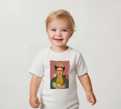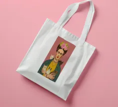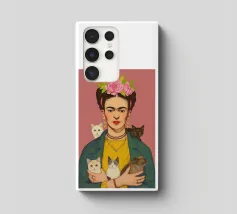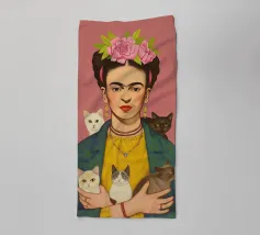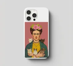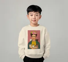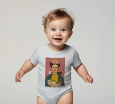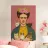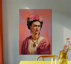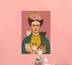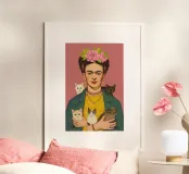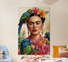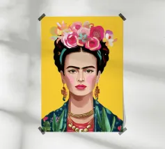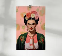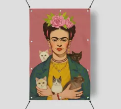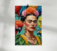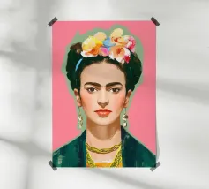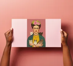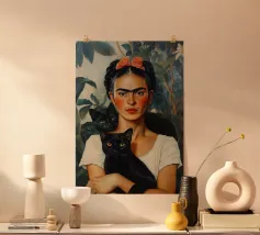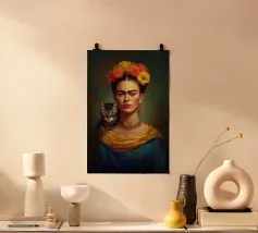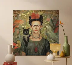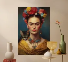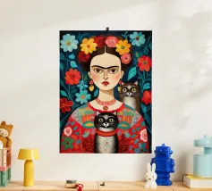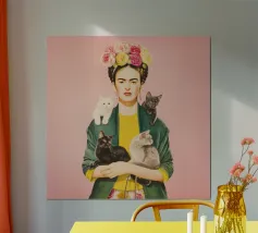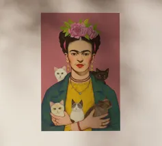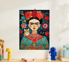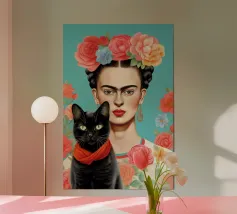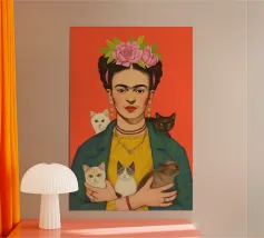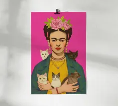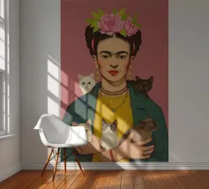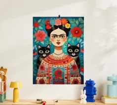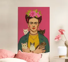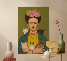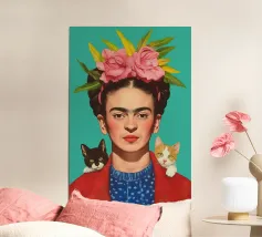 In this digital mural, Frida Kahlo is depicted in a self-portrait with baby cats amidst a scene of Mexican art. The painter Frida Kahlo is resplendent in traditional Mexican dress and a wreath of floral hair, symbolising her connection to nature and Mexican culture. The portrait of Frida Kahlo is presented in figurative wall art with a minimalist background in a solid turquoise-green colour. The bright colour palette and symbolism in this artwork captures the unique personality and artistic vision of Frida Kahlo.