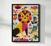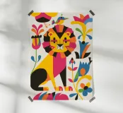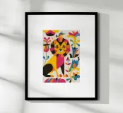 A stylized cat standing among abstract flowers and plants. The cat is depicted in a colorful and geometric style.