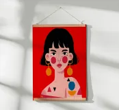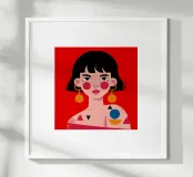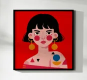 This painting features a person with black hair wearing a colorful outfit with geometric shapes. The background is red, and the person is adorned with large, circular earrings.