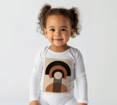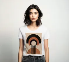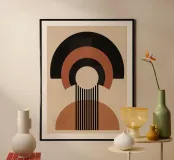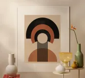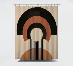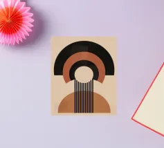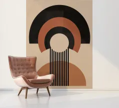 This elegant design combines clear geometric shapes with warm earthy colours such as black, brown and beige. The stylised sun, framed by curved arches and dynamic stripes, lends depth and harmony to the motif. Perfect for lovers of minimalist and timeless art. This design is ideal for wall murals, cushions, T-shirts and other products that bring modern elegance to any home.