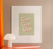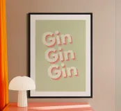 Adorn your wall with the playful and stylish 'Gin Gin' art print, capturing a fun retro vibe. Ideal for your home bar, kitchen, or living room, this wooden framed piece is perfect for gin enthusiasts and adds a quirky touch to any space.