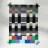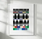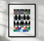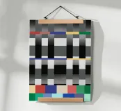 A geometric pattern composed of various rectangles, with sections defined by shades of gray and bold horizontal stripes in contrasting colors like red, blue, and green. The arrangement creates a structured and vibrant visual effect, with the colors forming a grid-like structure.