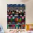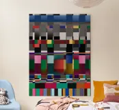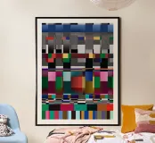 An abstract composition features a series of geometric shapes and bold, vibrant colors arranged in a grid pattern. Distinctive blocks of color are interspersed with linear elements, creating a visually dynamic and modern design.