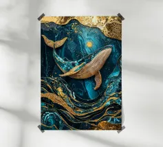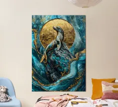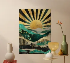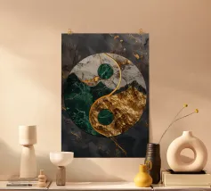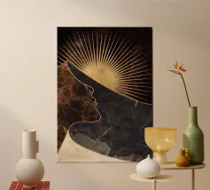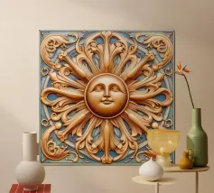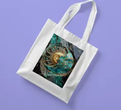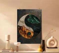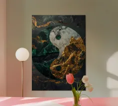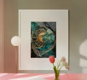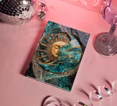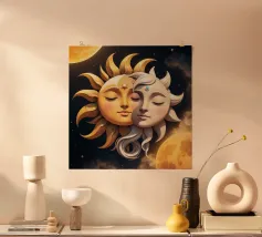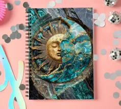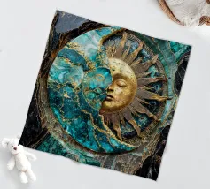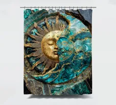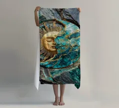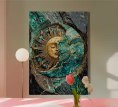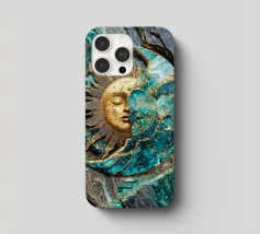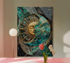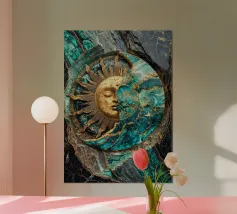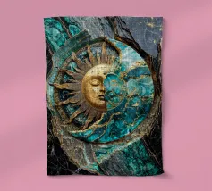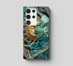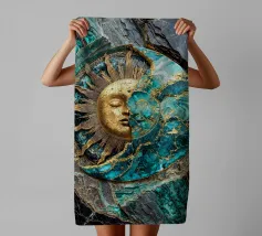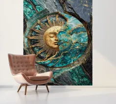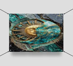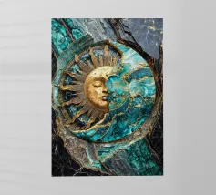 The image features a circular design split into two halves, representing the sun and the moon. The sun side is golden with a human-like face and radiating sunbeams, while the moon side is a marbled teal and gold, also with a face. The background appears to be a textured marble in shades of teal, black, and gold.